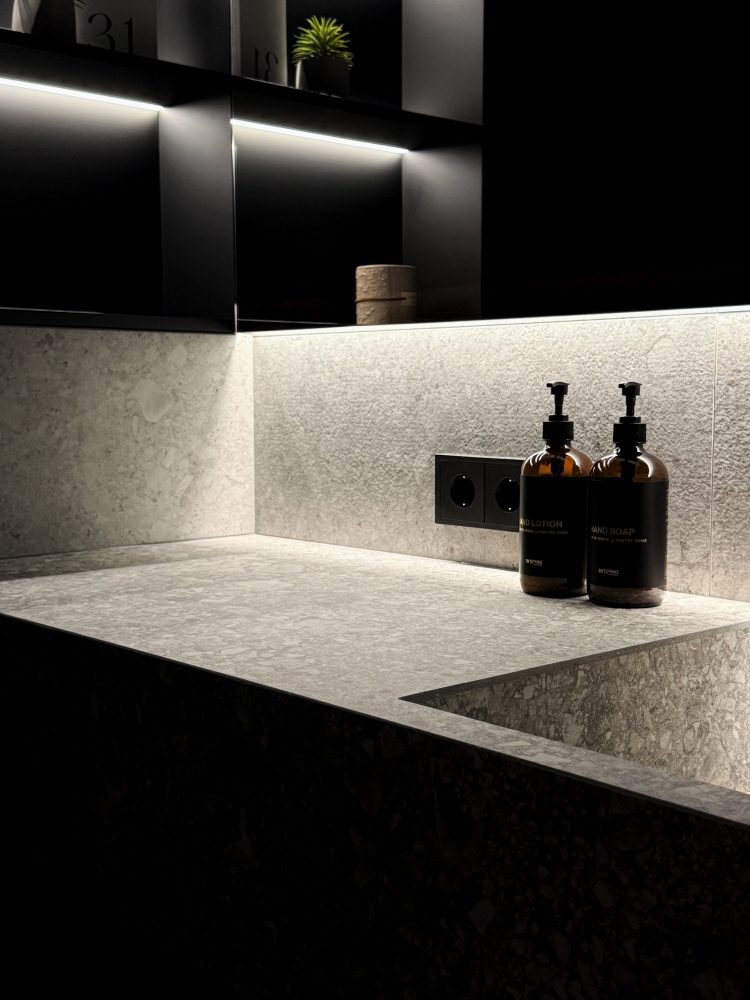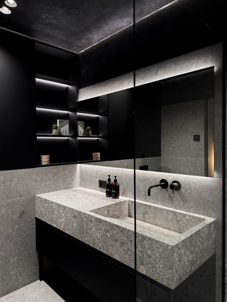 Візуальну легкість забезпечують невагомі перегородки з прозорого скла, що дозволяють світлу вільно циркулювати та розчиняти межі зон. На фоні суворого каменю особливо ефектно виглядає матова чорна фурнітура – вона, наче витончені штрихи тушшю на полотні, розставляє фінальні графічні акценти. Завершує композицію томна камерна підсвітка, яка м’яко підкреслює рельєф стін і занурює простір у гру світла й тіні, ідеальну для вечірнього відновлення.