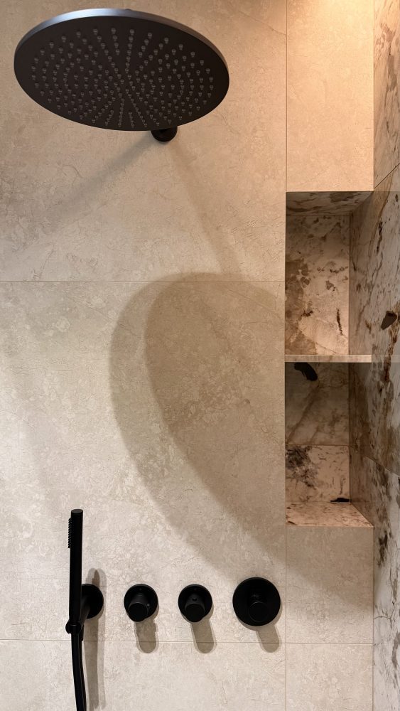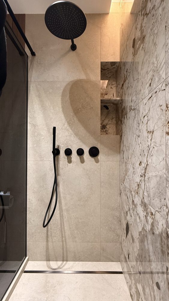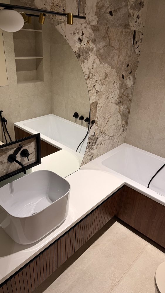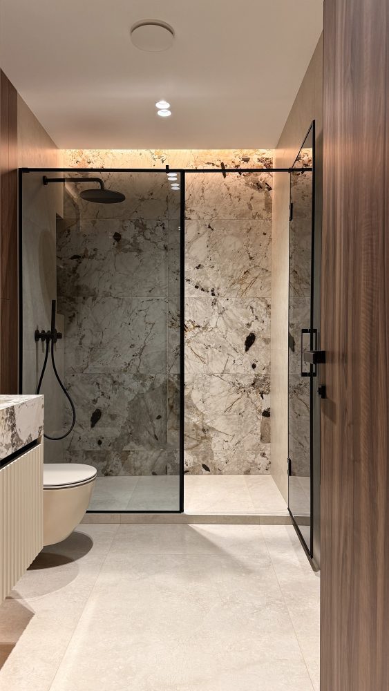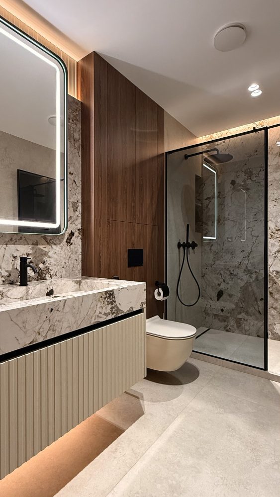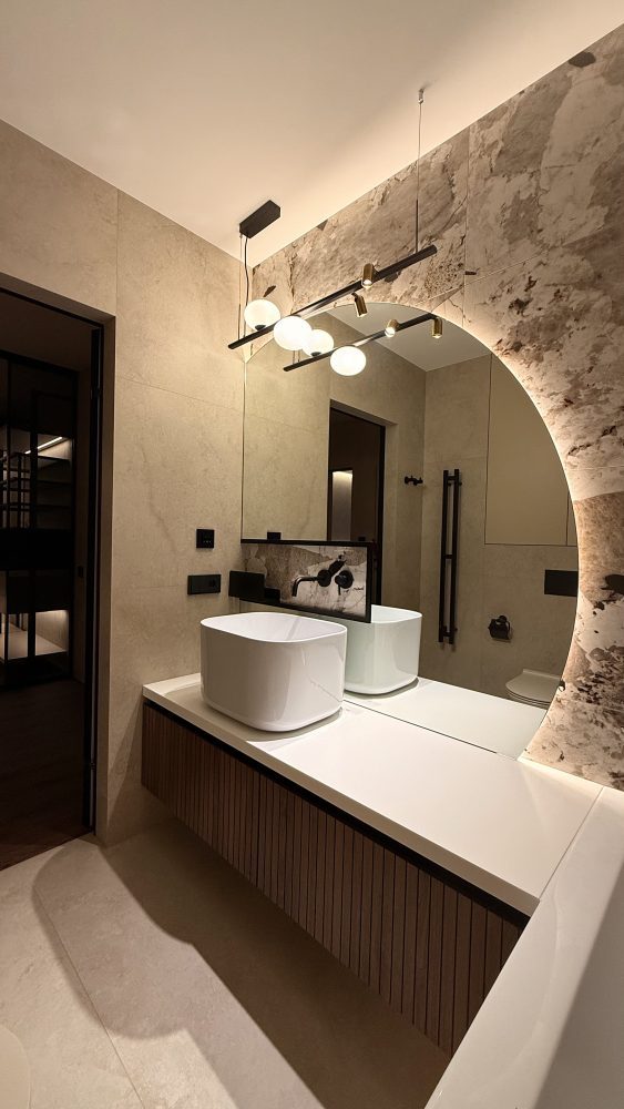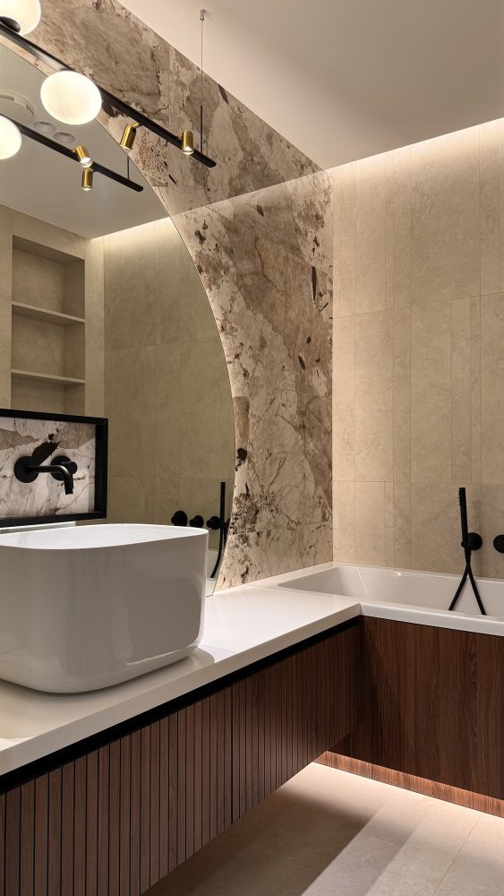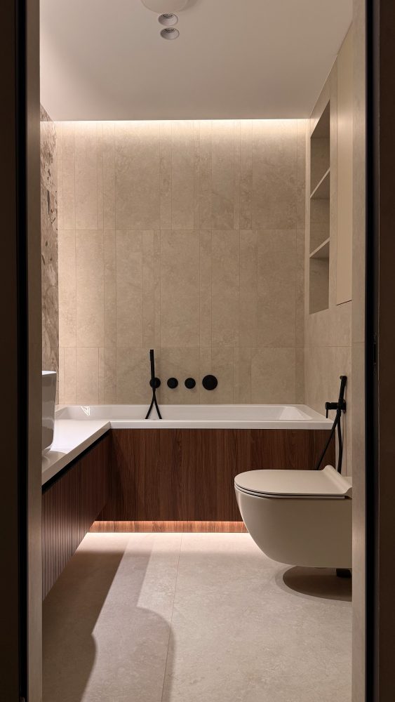 Ванна кімната та душова зона стали логічним втіленням загальної стилістики квартири, де панує філософія «тихої розкоші». Простір побудований на монохромній палітрі бежевих відтінків у поєднанні з масштабним використанням натурального каменю. Це інтер’єр, де візуальна стриманість зустрічається з тактильним багатством матеріалів, створюючи атмосферу приватного спа-салону без зайвого візуального шуму.