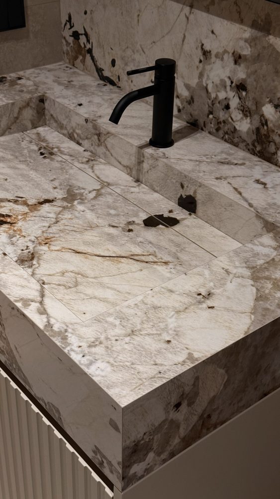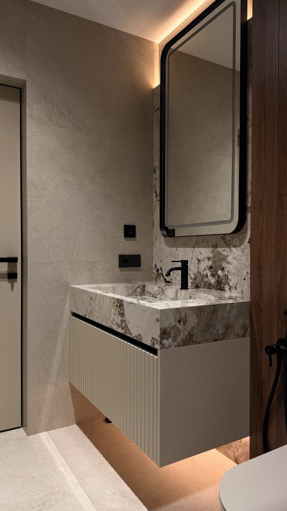 Майстерне поєднання фактур дозволяє каменя розкрити свою природну глибину, залишаючись при цьому лаконічним та делікатним. Тут відсутні кричущі акценти – натомість простір дихає гармонією та естетичною чистотою. Таке дизайнерське рішення підкреслює статус власників через бездоганну якість виконання та виважений баланс кожної лінії, перетворюючи щоденні ритуали на хвилини справжнього естетичного задоволення.