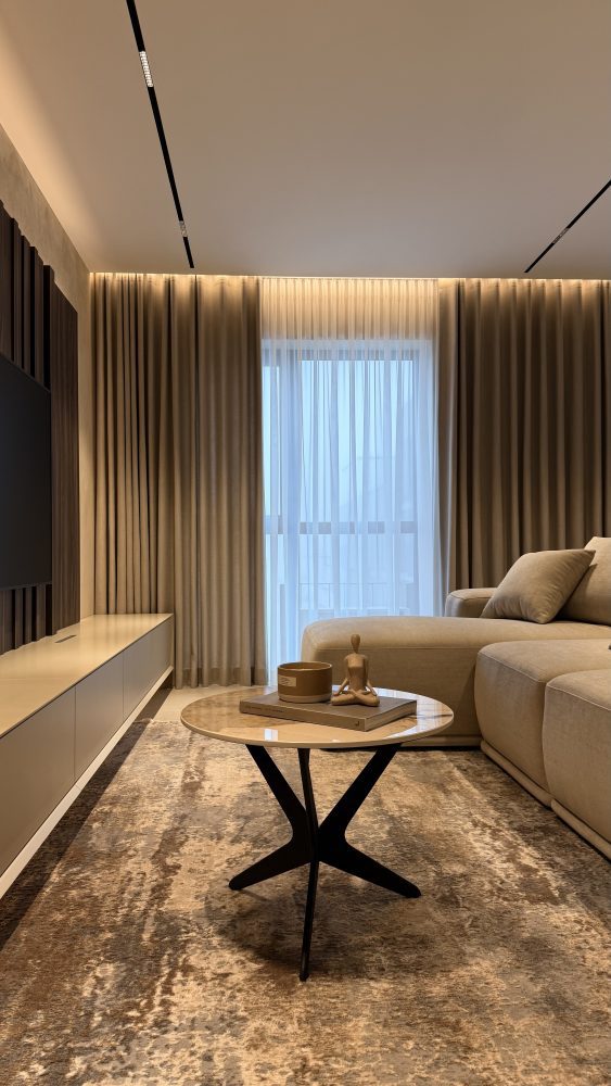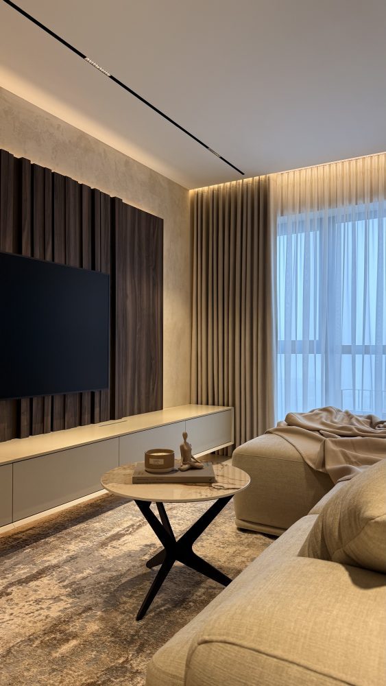 Тепла стилістика вітальні стає природним продовженням кухонної зони, створюючи цілісний та безбар’єрний простір для життя. Домінантою відпочинку виступає розкішний кутовий диван, що запрошує до релаксу, а підвісна ТВ-тумба з інтегрованими системами зберігання додає інтер’єру архітектурної легкості.