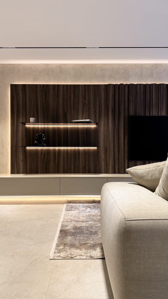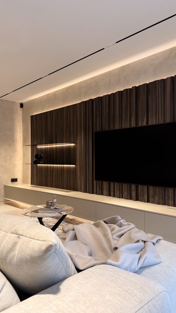 Стіна, оформлена як монументальне дерев’яне полотно, привносить у кімнату природну фактурність, стаючи ідеальним фоном для сімейних вечорів. Особливого шарму композиції надають металеві полиці, де в променях м’якої підсвітки експонується улюблений декор. Це простір, де функціональність зустрічається з високим стилем, утворюючи гармонійне місце сили для всієї родини. Кожна деталь тут працює на єдину мету: об’єднати близьких людей у атмосфері затишку, естетичного задоволення та щирого спілкування.
