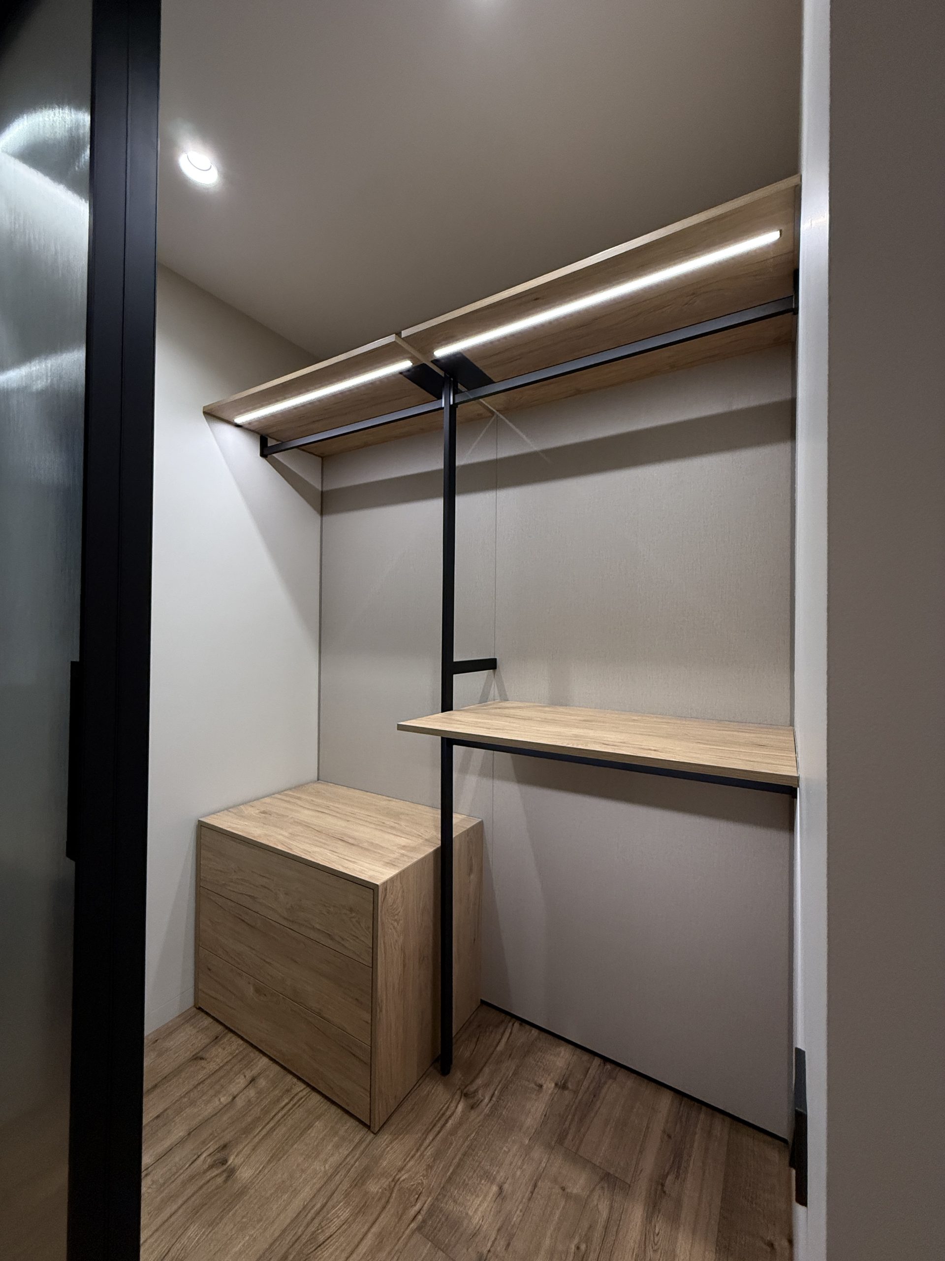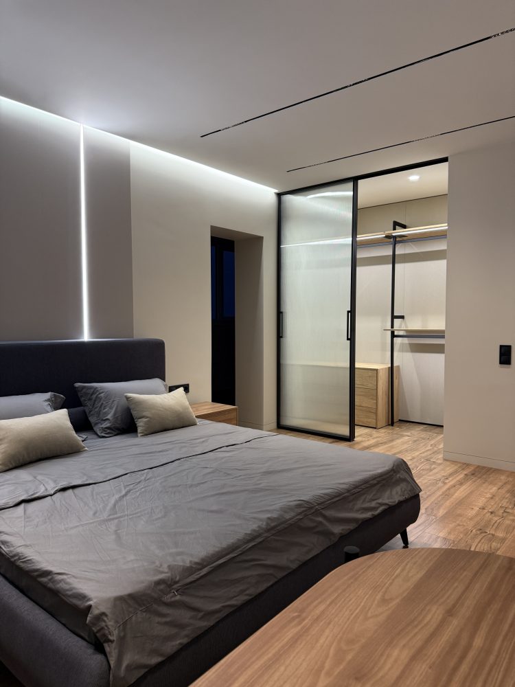 У спальній кімнаті розташована компактна, але функціональна гардеробна, вхід до якої оформлений сучасними розсувними скляними дверима. Для максимальної зручності та створення затишку в гардеробній передбачене вбудоване внутрішнє підсвічування.