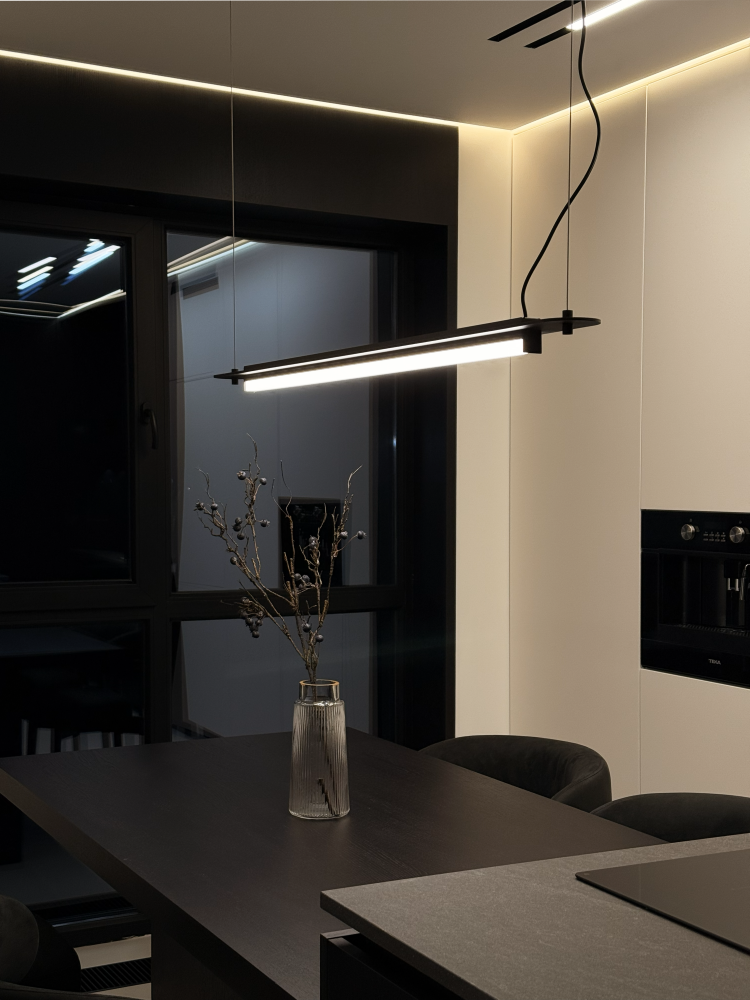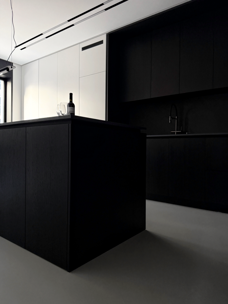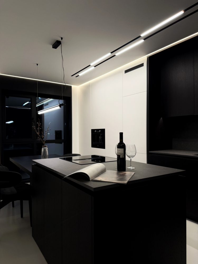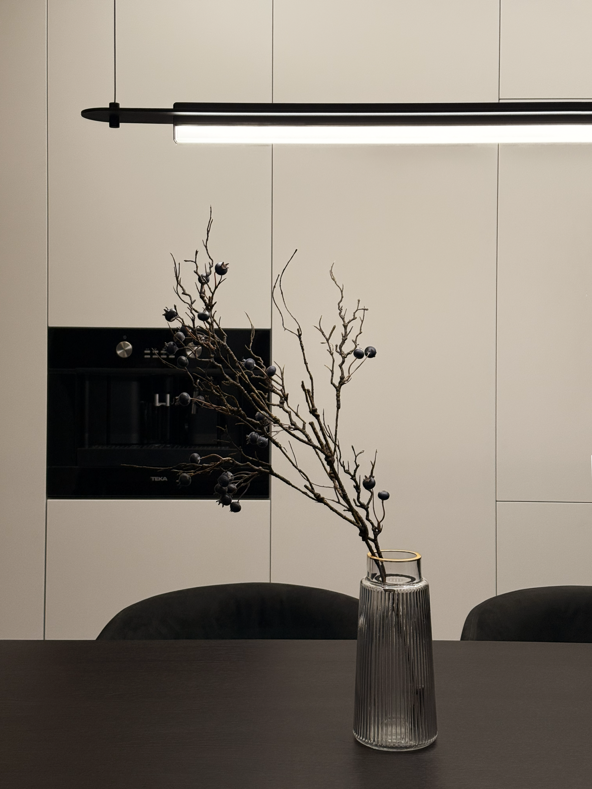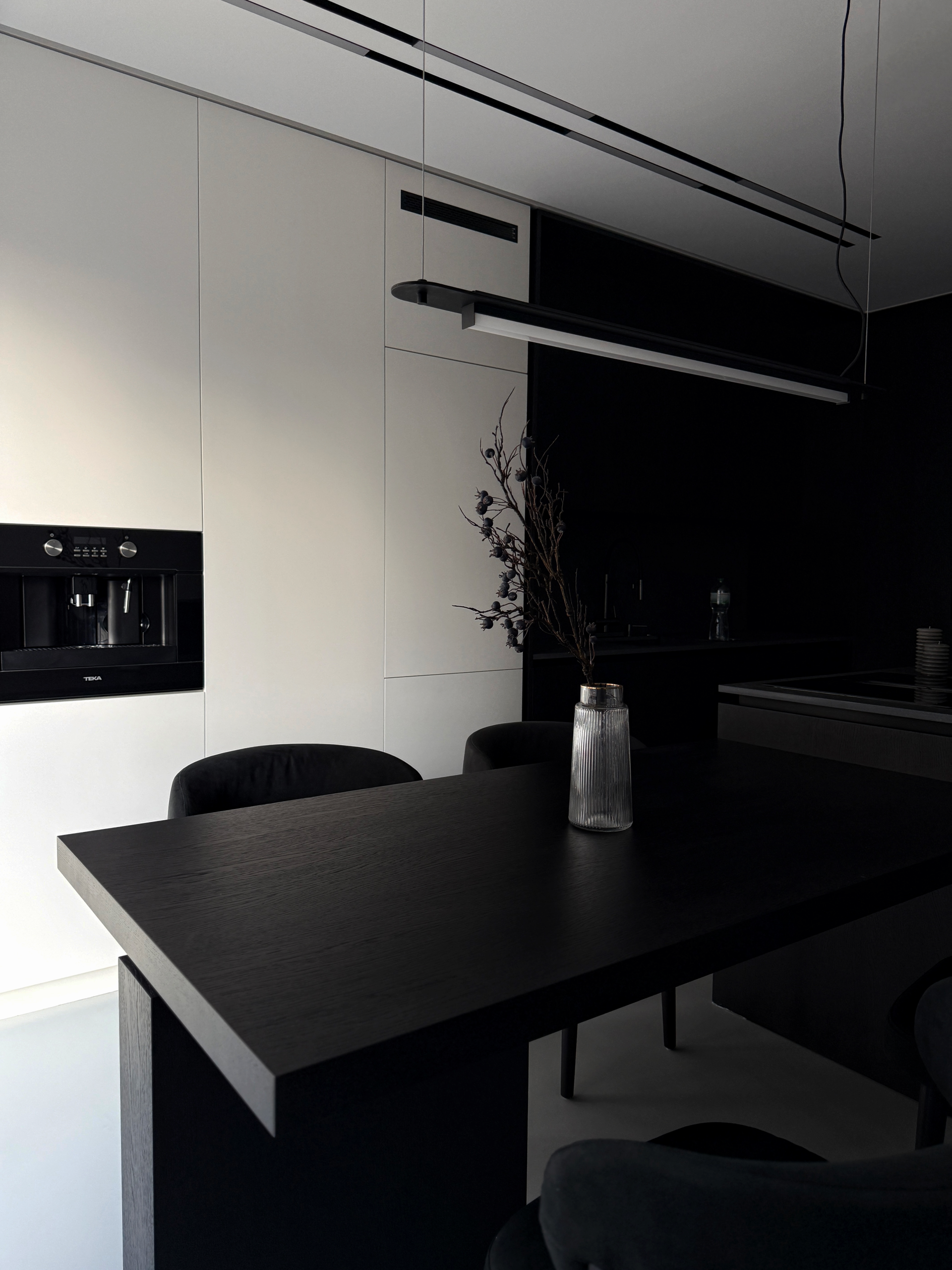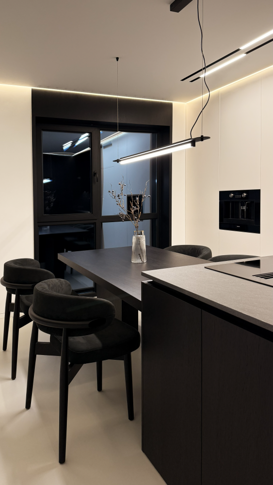 Основою концепції стали чисті, безкомпромісні лінії. Високі фронтальні шафи від підлоги до стелі створюють ефект монолітної стіни, за якою майстерно прихована повна екосистема побутової техніки. Відсутність зайвих деталей та інтегровані профілі замість традиційних ручок підкреслюють графічність інтер’єру, перетворюючи кухонну зону на арт-об’єкт.