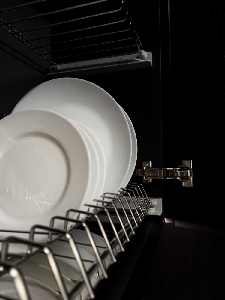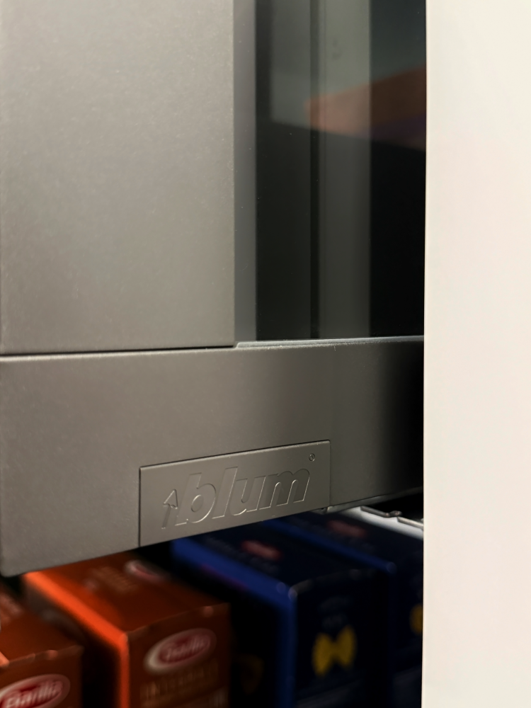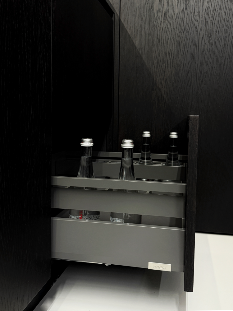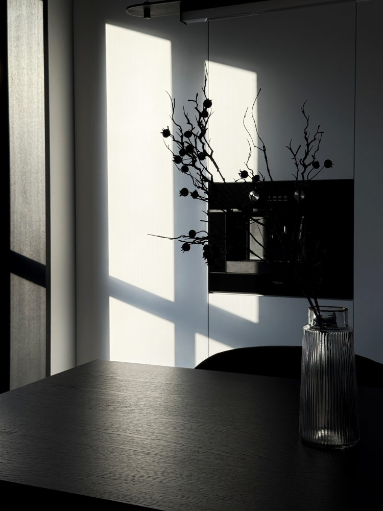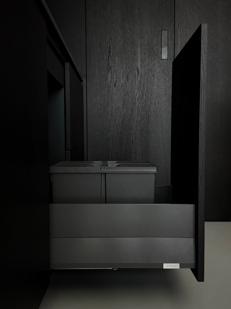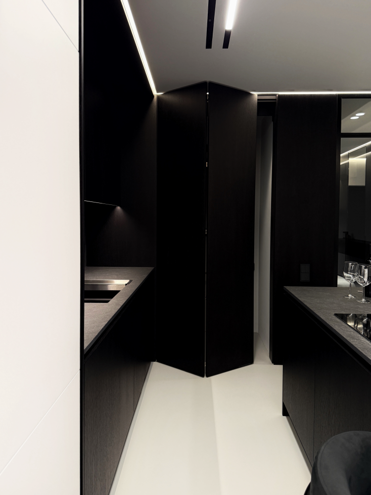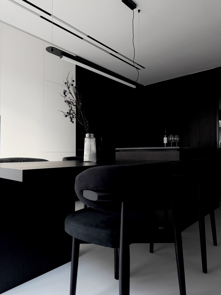 Основою концепції стали чисті, безкомпромісні лінії. Високі фронтальні шафи від підлоги до стелі створюють ефект монолітної стіни, за якою майстерно прихована повна екосистема побутової техніки. Відсутність зайвих деталей та інтегровані профілі замість традиційних ручок підкреслюють графічність інтер’єру, перетворюючи кухонну зону на арт-об’єкт.
