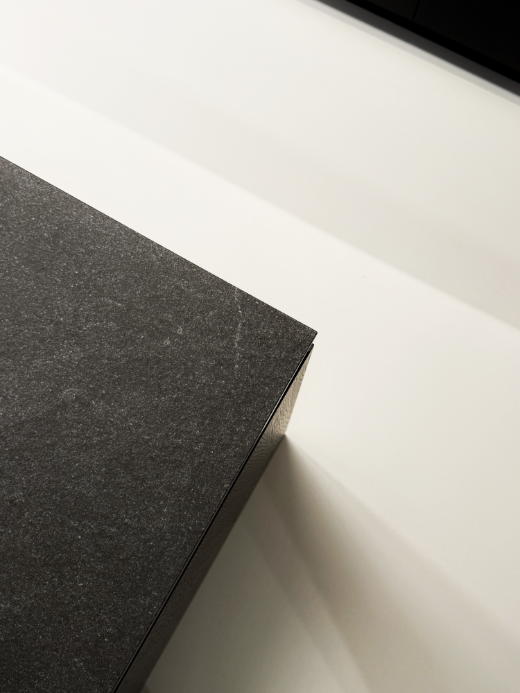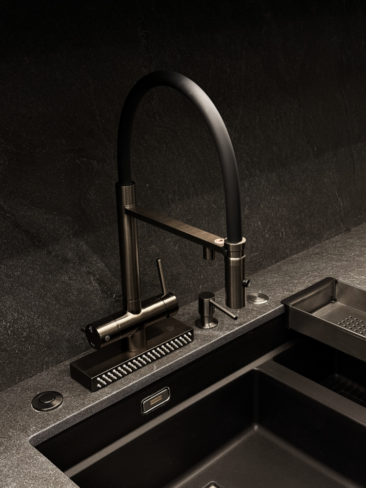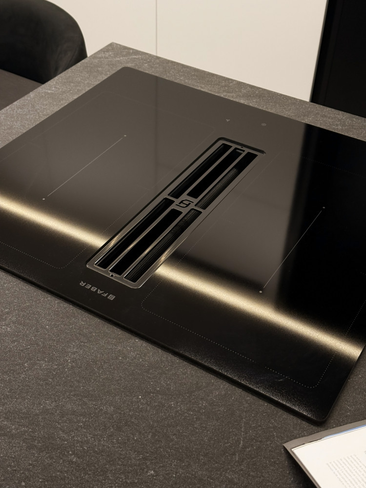 Головним візуальним та функціональним акцентом є величний кухонний острів. Його масивна стільниця з ідеальною геометрією приховує в собі технологічне серце кухні. Інтегровані інновації: варильна поверхня останнього покоління з вбудованою витяжкою позбавляє простір від громіздких конструкцій над головою, зберігаючи перспективу відкритою та легкою.