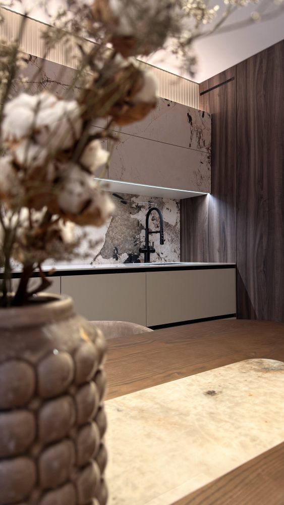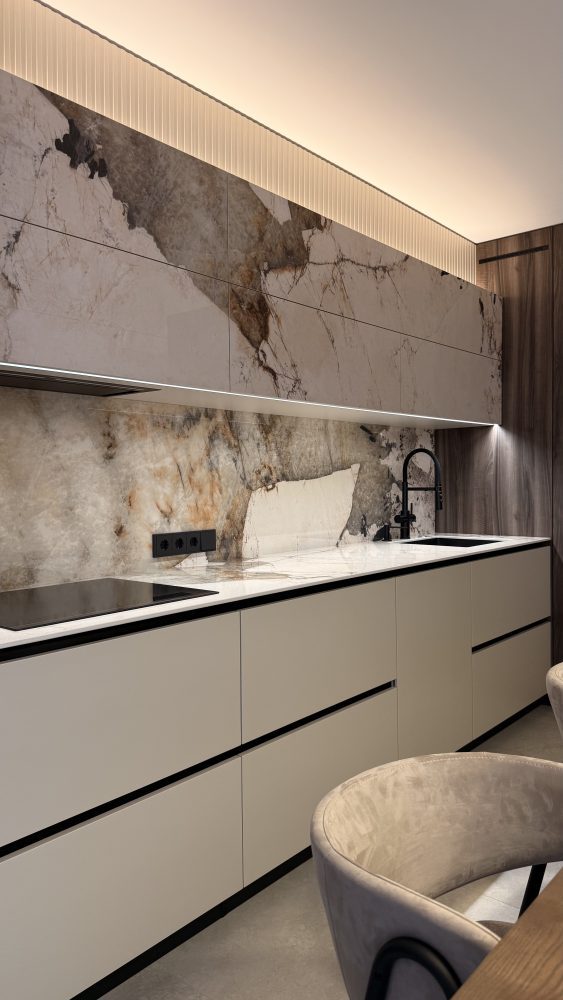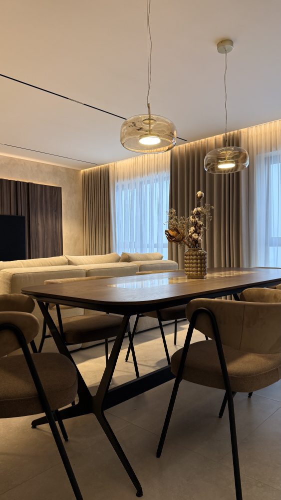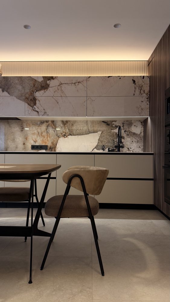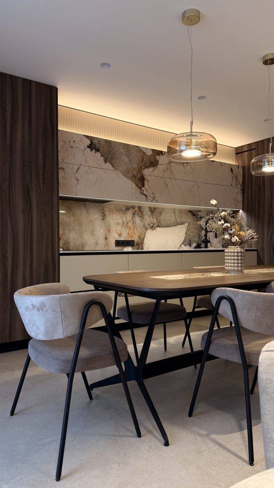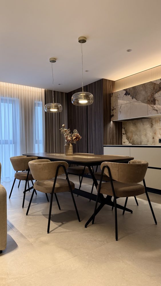 Естетика простору вибудована на делікатному діалозі теплих карамельних тонів та монументальності природного мармуру. Центром композиції стала обідня група: лаконічні стільці з м’яким текстильним профілем створюють делікатний контраст із каменем, перетворюючи зону трапези на острів абсолютного комфорту. Це інтер’єр, де розкіш проявляється не в надмірності, а в бездоганній якості кожної фактури.