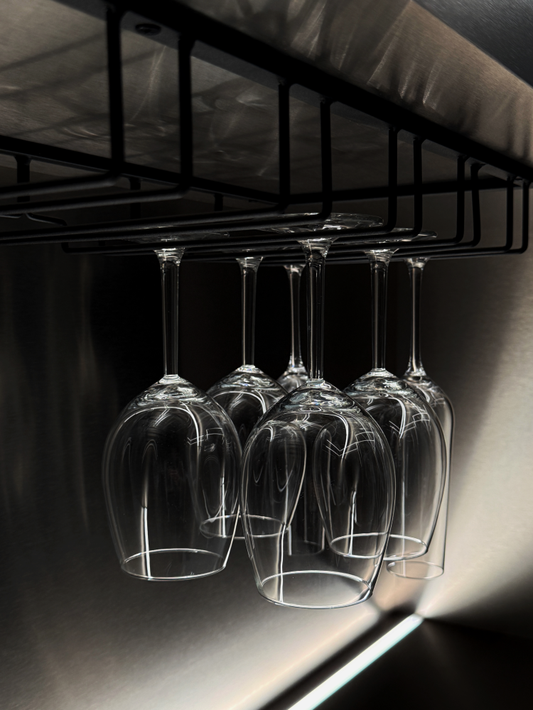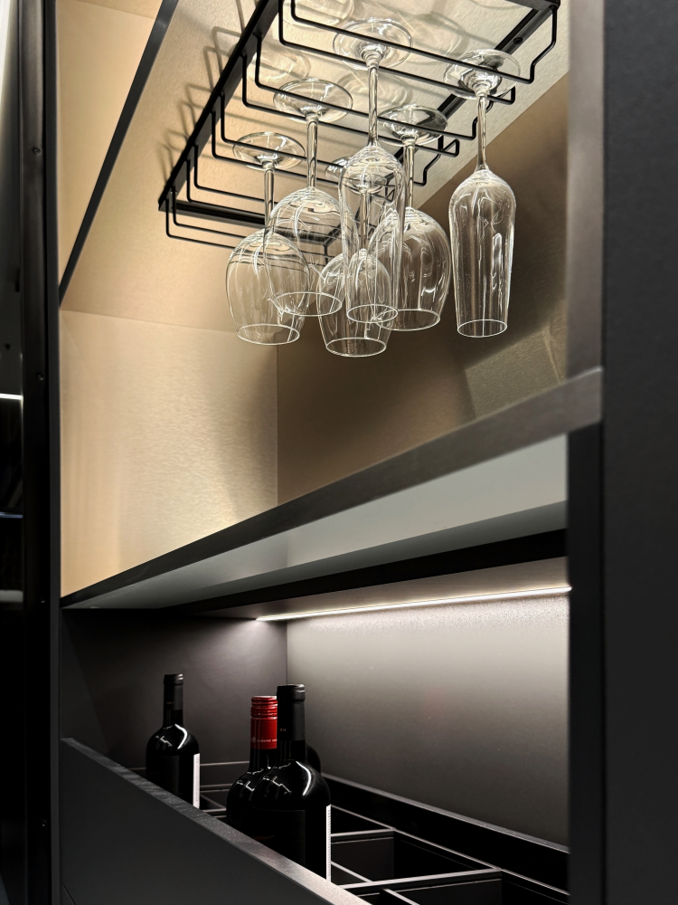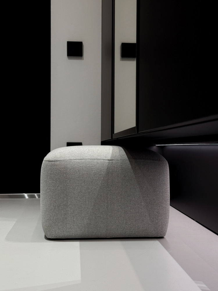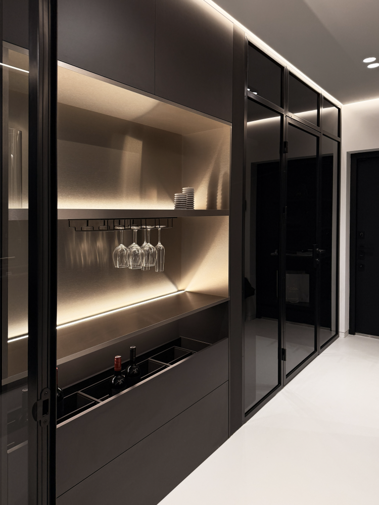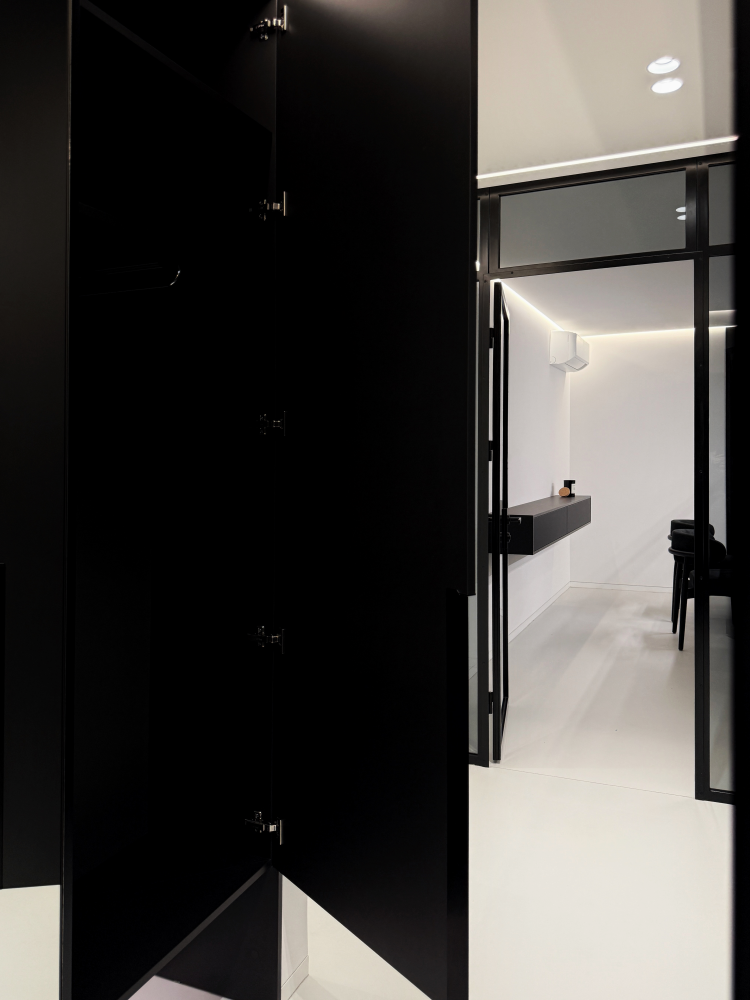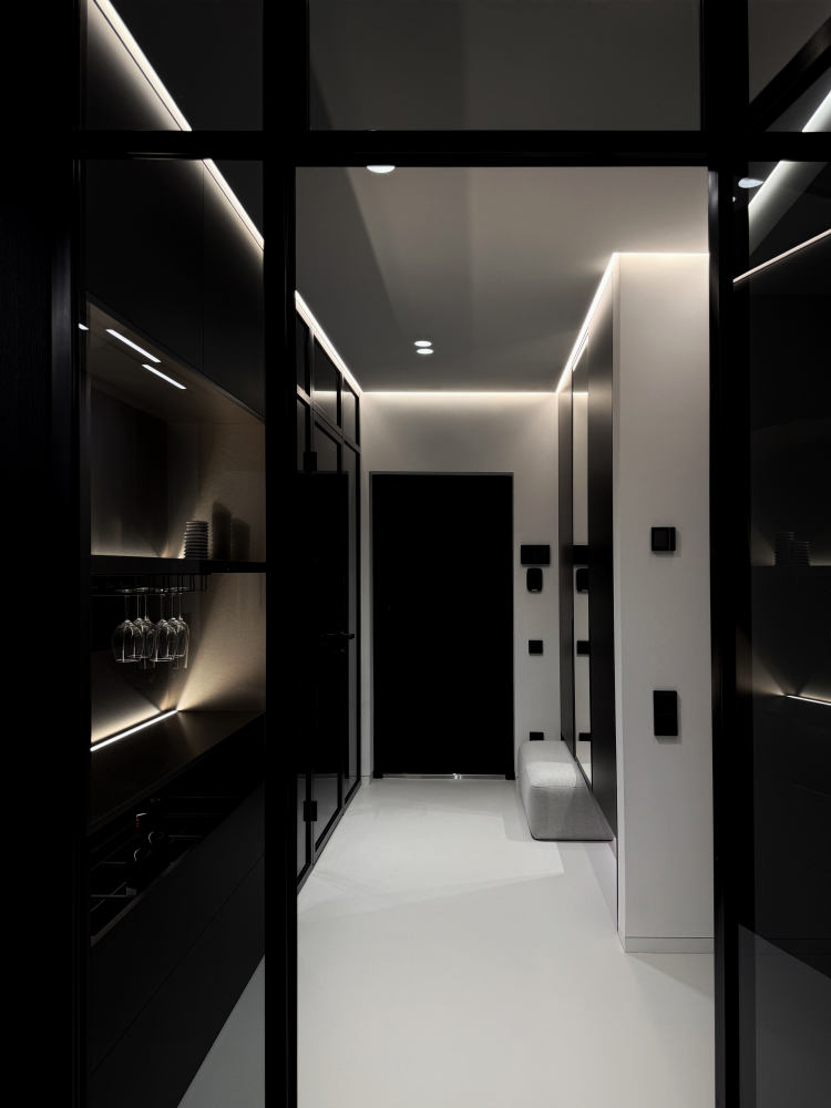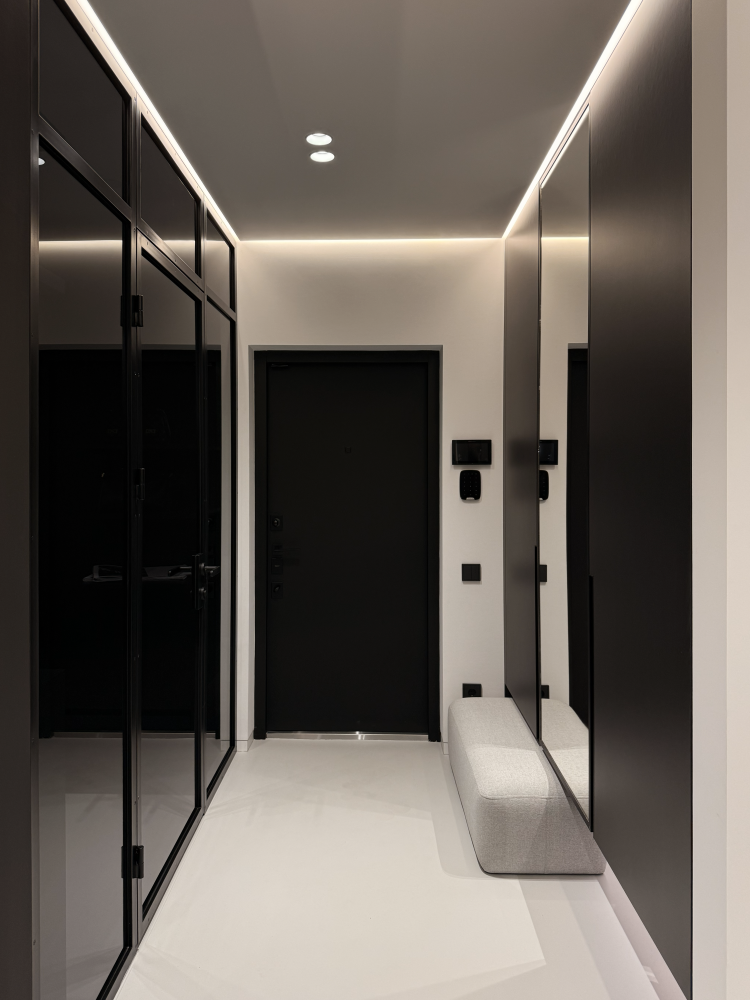 Вхідна група вражає своєю архітектурною чистотою. Стіни, виконані у бездоганному світлому відтінку, слугують полотном для графічних чорних акцентів. Головний візуальний магніт – підвісна гардеробна система. Завдяки інтегрованій контурній підсвітці створюється ілюзія, ніби шафа повністю відірвана від підлоги, вільно паруючи у просторі. Матові фасади меблів поглинають світло, додаючи інтер’єру графічності.