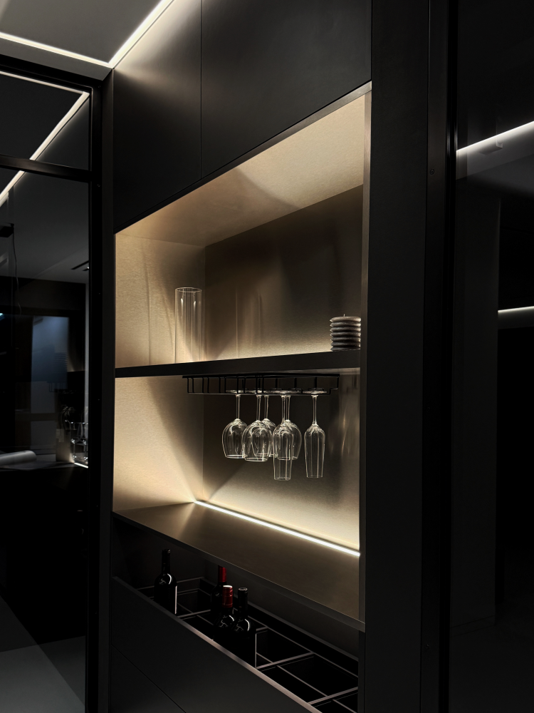 Ця квартира заявляє про свій характер з першого кроку. Це не просто житло, а витончена гра контрастів, де світло зустрічається з темрявою, а масивні форми набувають невагомості. Концепція Black Style тут розкривається через філософію радикального мінімалізму, де кожна деталь має значення.