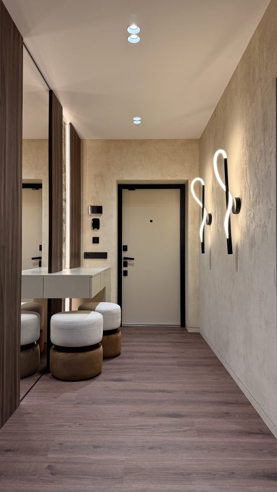 Передпокій – це витончена прелюдія до знайомства з інтер’єром, що з перших секунд занурює в атмосферу дому. Високе дзеркало в підлогу візуально розширює межі, наповнюючи простір повітрям та світлом, тоді як вишукане поєднання дерева й мармуру задає тон усій квартирі. Це місце, де естетика зустрічає гостя прямо з порога, обіцяючи бездоганний комфорт у кожній деталі.