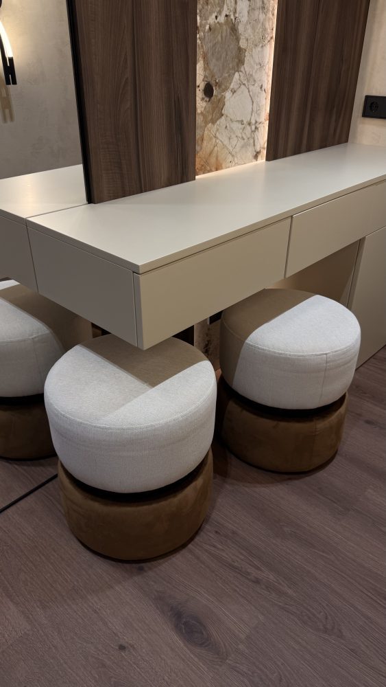 Центром функціональності став лаконічний консольний стіл – ідеальне місце для дрібниць, ключів та засобів догляду, що допомагають підтримувати бездоганний вигляд перед виходом. Затишні м’які пуфи додають зоні входу домашнього тепла, перетворюючи прагматичний простір на зону естетичної насолоди. Тут кожен елемент підпорядкований єдиному ритму життя, де зручність та високий стиль існують у повній синергії.