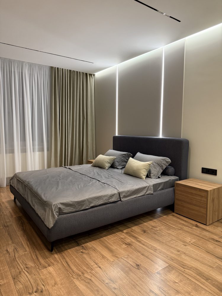 Простора та затишна спальня є гармонійним продовженням загальної концепції дизайну квартири. Центральне місце тут займає велике двоспальне ліжко з м’яким узголів’ям, що запрошує до відпочинку.