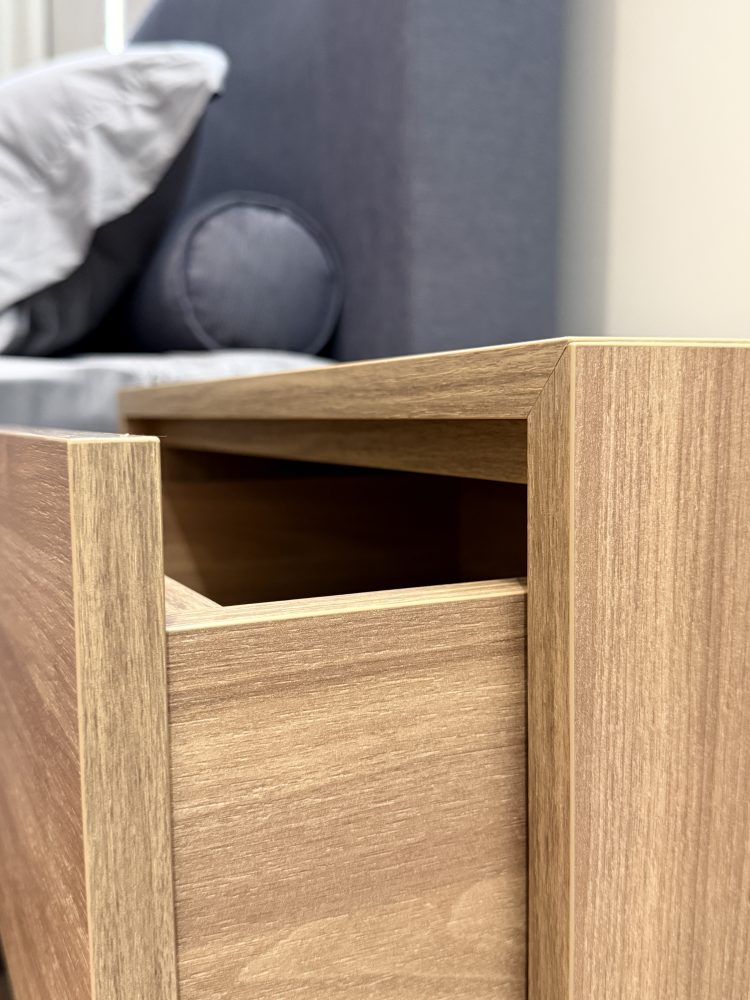 Приліжкові тумби з текстурою дерева — ідеально гармоніюють із кольором підлогового покриття, створюючи цілісний та теплий інтер’єр. Логічним і функціональним продовженням цієї зони є продуманий вхід у гардеробний простір.